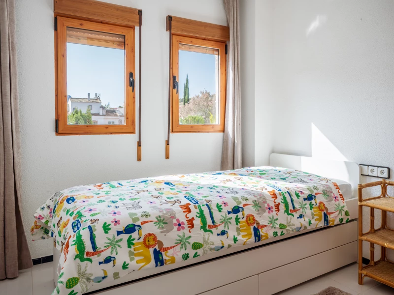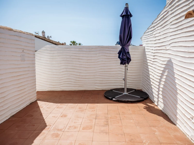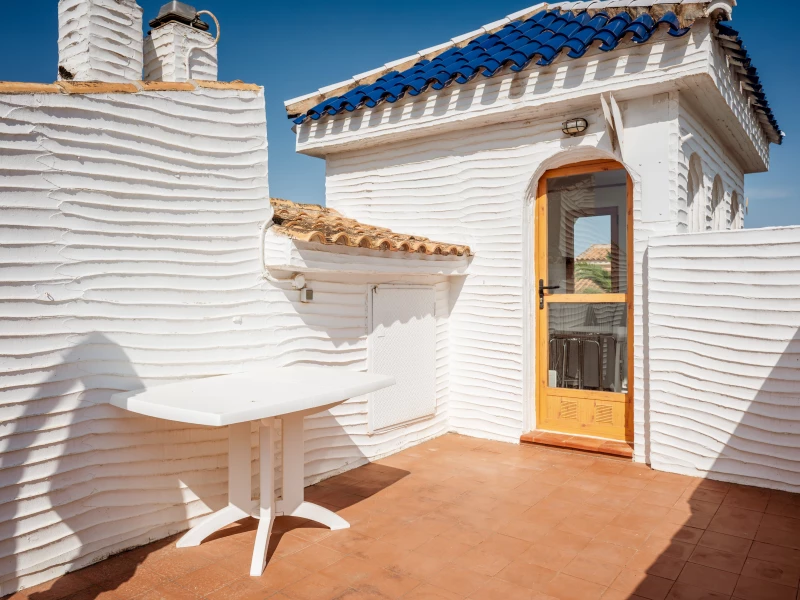 Het ruime dakterras is de ideale plek om in alle rust van de Spaanse zon te genieten – de hele dag door. Of je nu wilt zonnebaden, borrelen of ’s avonds genieten van het uitzicht, hier zit je altijd goed. In de afgesloten ruimte op het terras vind je een extra koelkast, barkrukken en een tafeltje: perfect voor een verfrissend drankje binnen handbereik. Een heerlijke plek om je vakantiedag ontspannen af te sluiten.